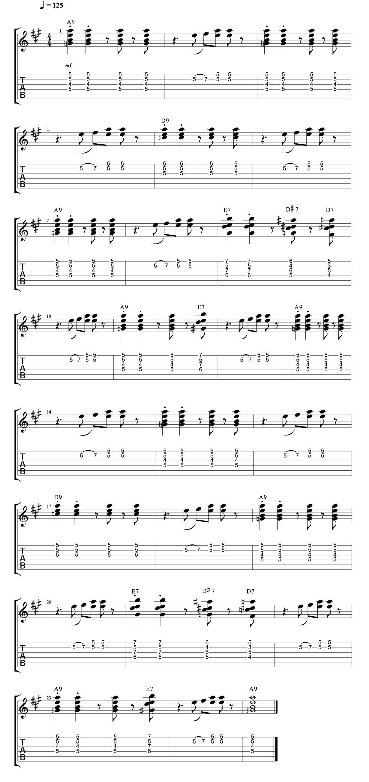 Let's stick to those funky top four string chords again for this example. We'll break down the 9th chords we've learned and continue to make space for the rest of your band. I tossed in a little major pentatonic riff on this one too, so don't let it catch you out! This is a straight feel, but it could also easily be used over a rumba. Rumbas are a popular feel in blues playing with a Latin influence, and a nice change when you've been playing a lot of shuffles. Check some out!