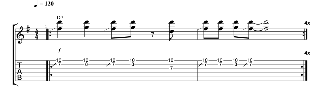Another George Benson-inspired riff, this double-stop exercise keeps the high D going on top with a cool rhythmic pattern featuring the F♯ and G. This funky fresh lick will help propel the rhythm section while tastefully filling out the lead register.